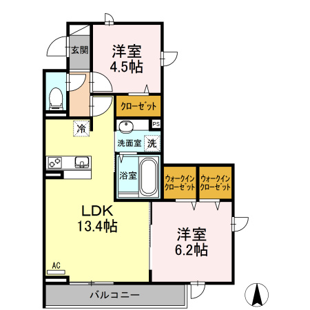 洋室 4.5帖/洋室 6.2帖/LDK 13.4帖 - 向き